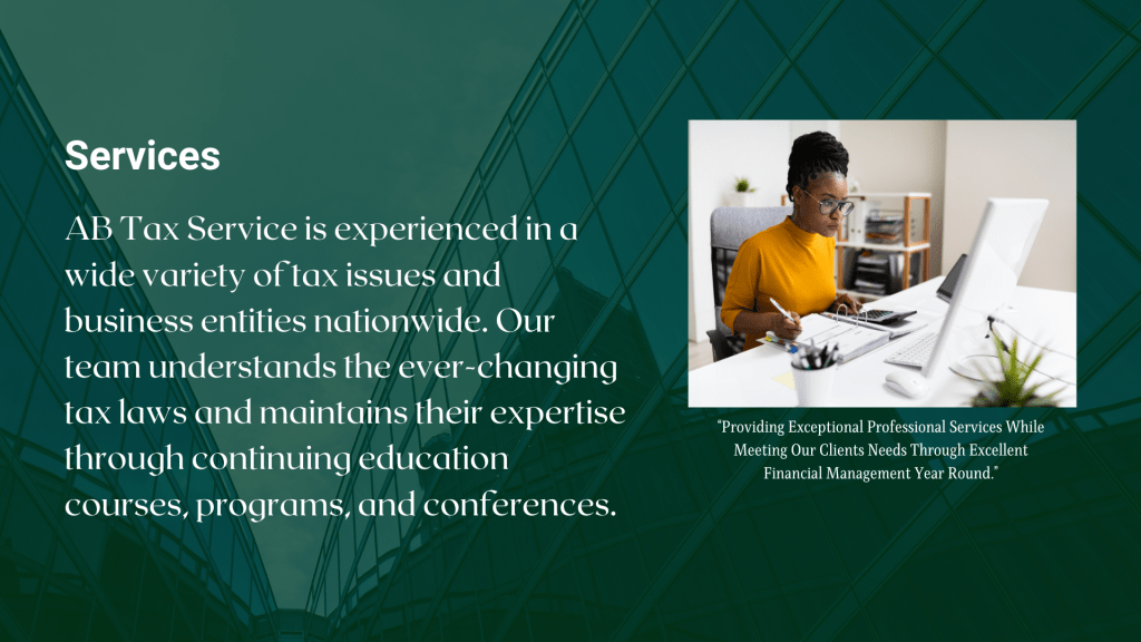 Disclaimer: Accountants | Business Advisors | Certified Public Accountants – AB Tax Service is a tax, accounting, and bookkeeping firm providing audit, assurance, tax, accounting, and advisory services to companies and individuals in the Florence County, SC area and throughout the United States. We offer several services including, tax planning, tax preparation, auditing, bookkeeping, and strategic planning.